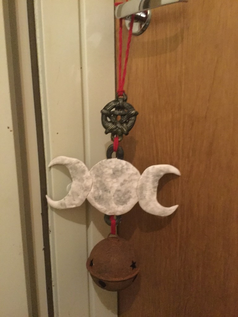 Ystävälläni on myynnissä toisenlainen noitakello ja tämä on tehty juuri minulle. Annoin hänelle suhteellisen vapaat kädet toteuttaa luovuuttaan ja muutamien tarkentavien kysymysten jälkeen syntyi tälläinen kaunokainen! Kolmoiskuu on Jumalattaren symboli ja pentagrammi on suojelun merkki. Maltan tuskin odottaa että saan ripustaa tämän uuden asuntoni oveen! Kuut on maalattu valkealla ja hopealla, kuin oikea kuu, ja kello on oikea, vanha kello.